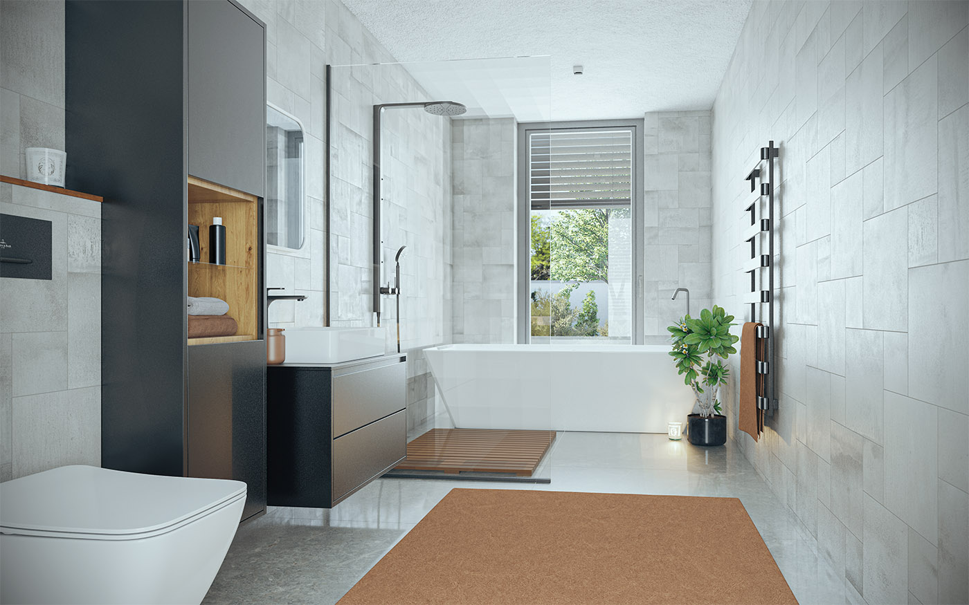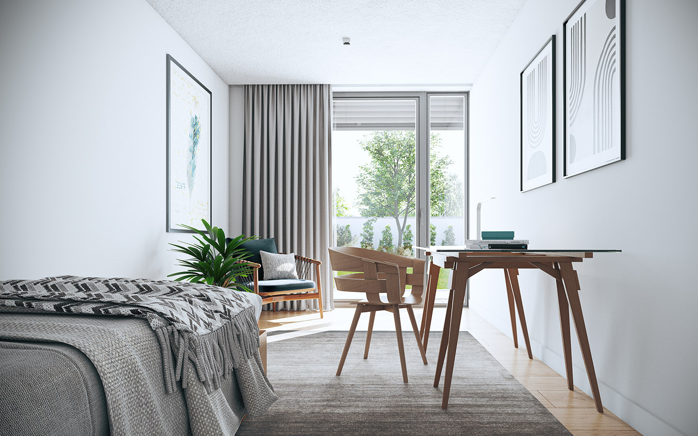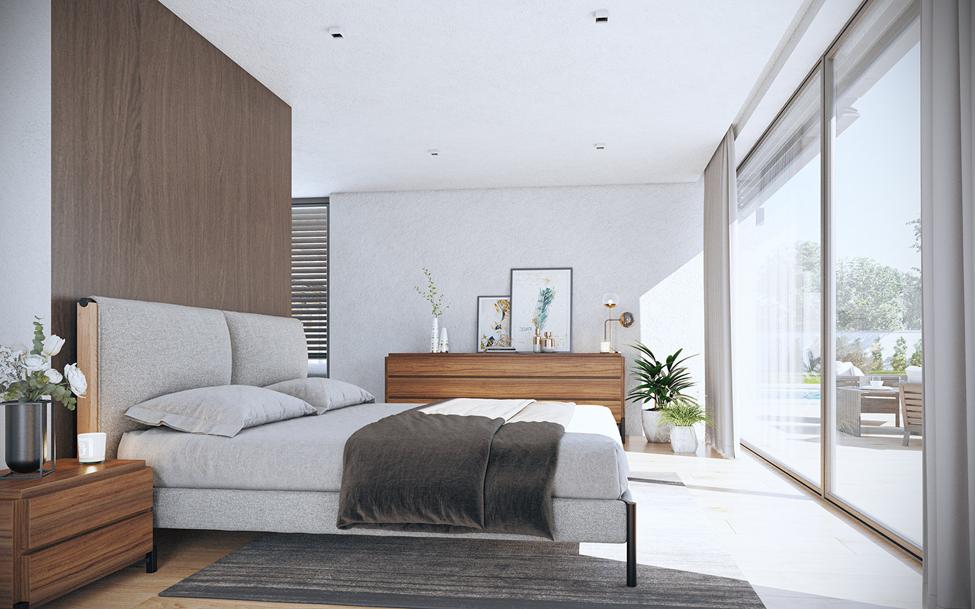 Drugim najważniejszym miejscem w domu stała się główna sypialnia, która jednocześnie w sposób fundamentalny łączy pokój z ogrodem, prywatną częścią ogrodu. Do sypialni przynależy bardzo przestronna garderoba i połączona z nią prywatna łazienka, która zapewni wszystko dla przyjemnego współżycia nawet przy różnych rodzinnych planach.