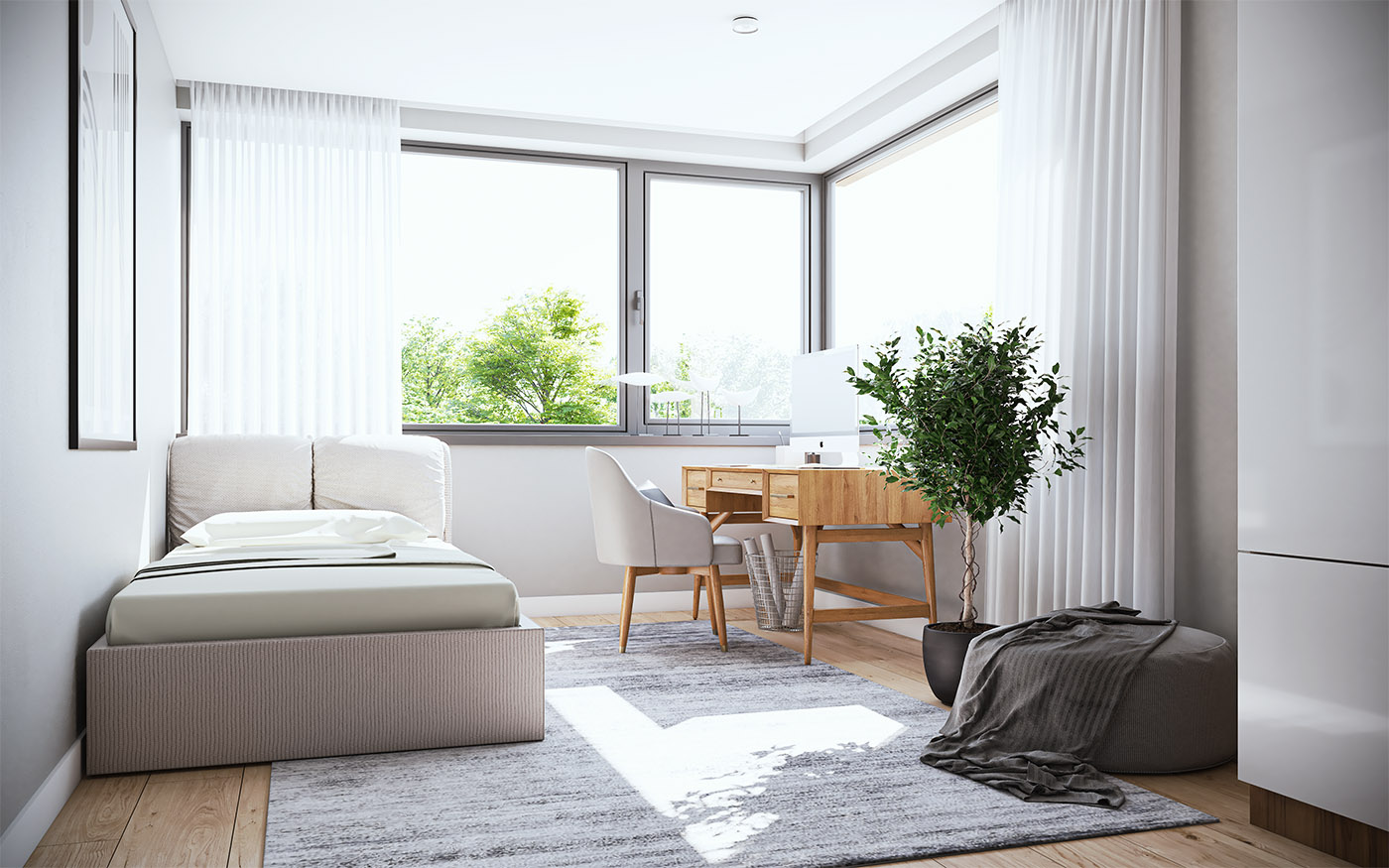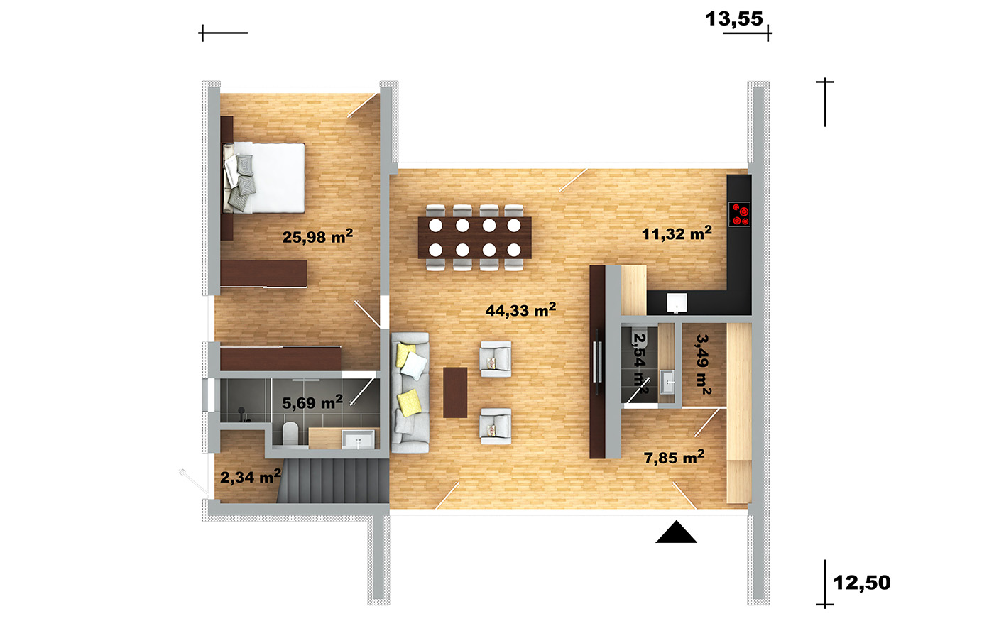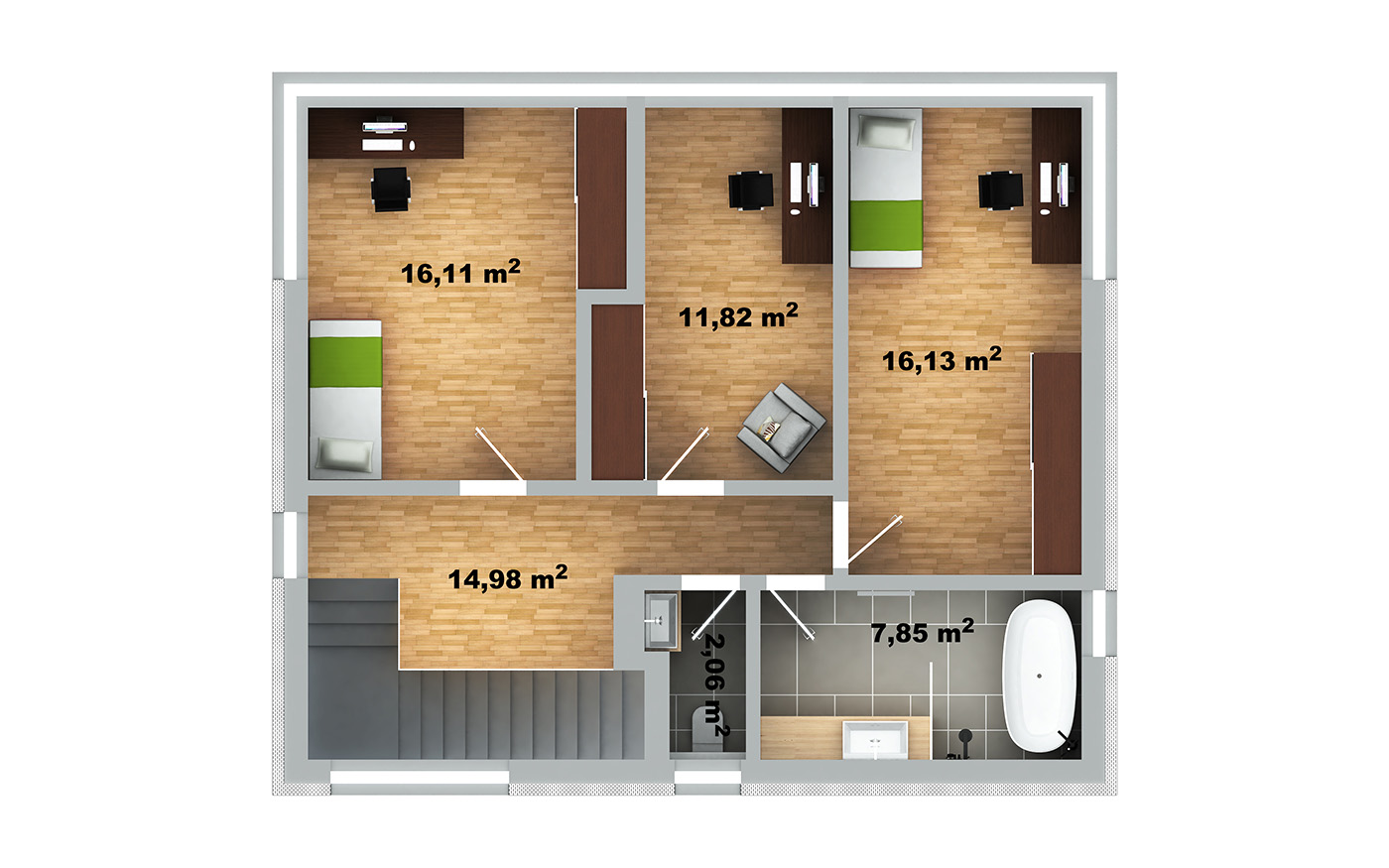 Na drugim piętrze znajdują się dwa większe pokoje i jeden zwykły, które od zewnątrz są połączone optycznie dużym oknem, pozwalającym na panoramiczny widok na zewnątrz. Pokoje posiadają oddzielną toaletę oraz łazienkę zlokalizowaną tuż obok nich.