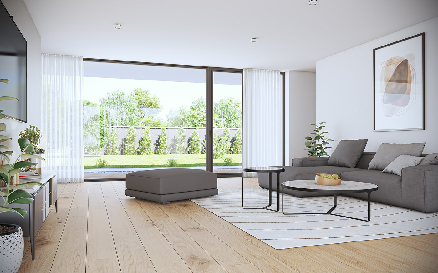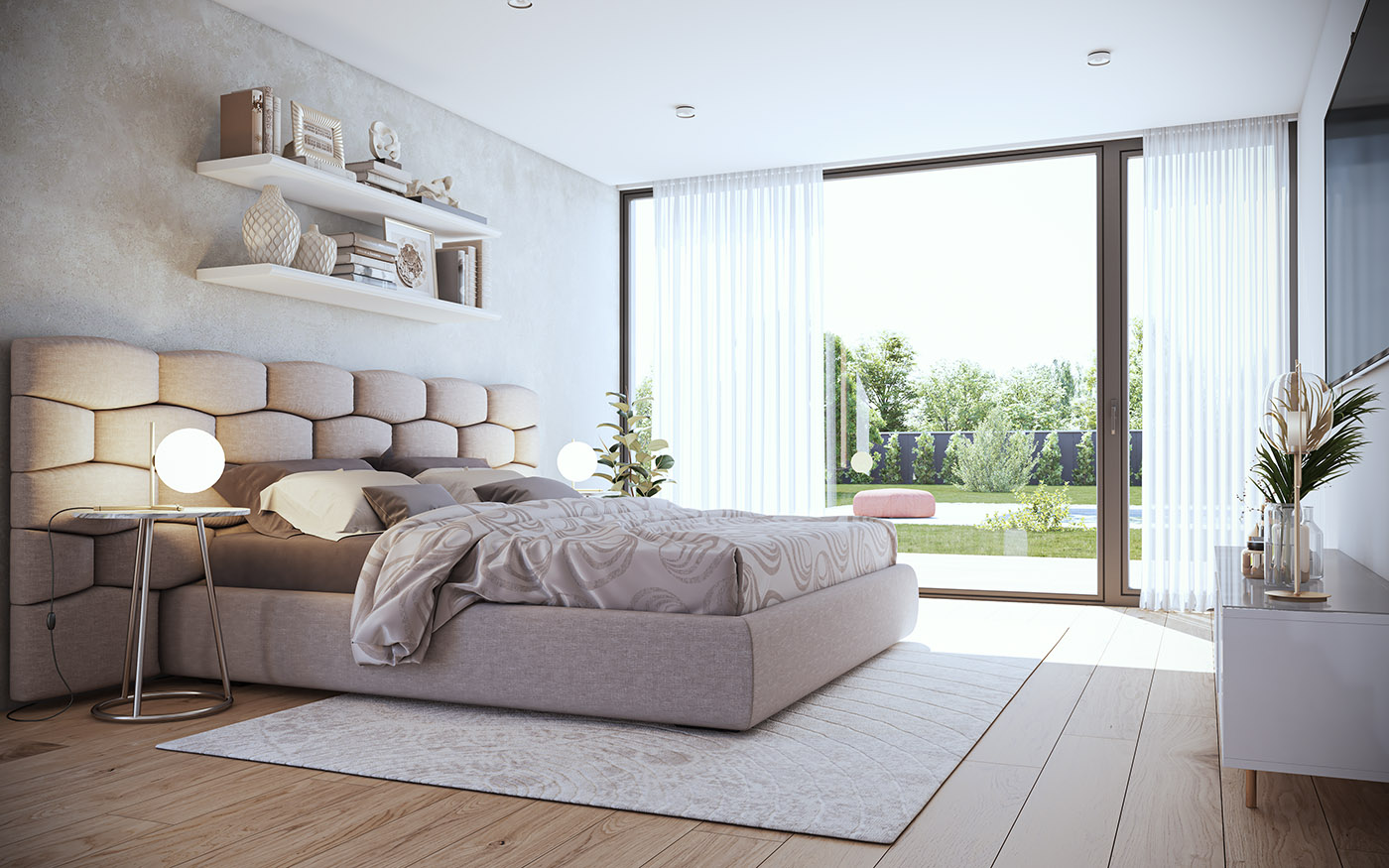 Sypialnia rodziców z dużą garderobą i łazienką w naturalny sposób łączy się z tą główną przestrzenią i jest dostępna przez jedne bardzo dobrze chłonne drzwi.