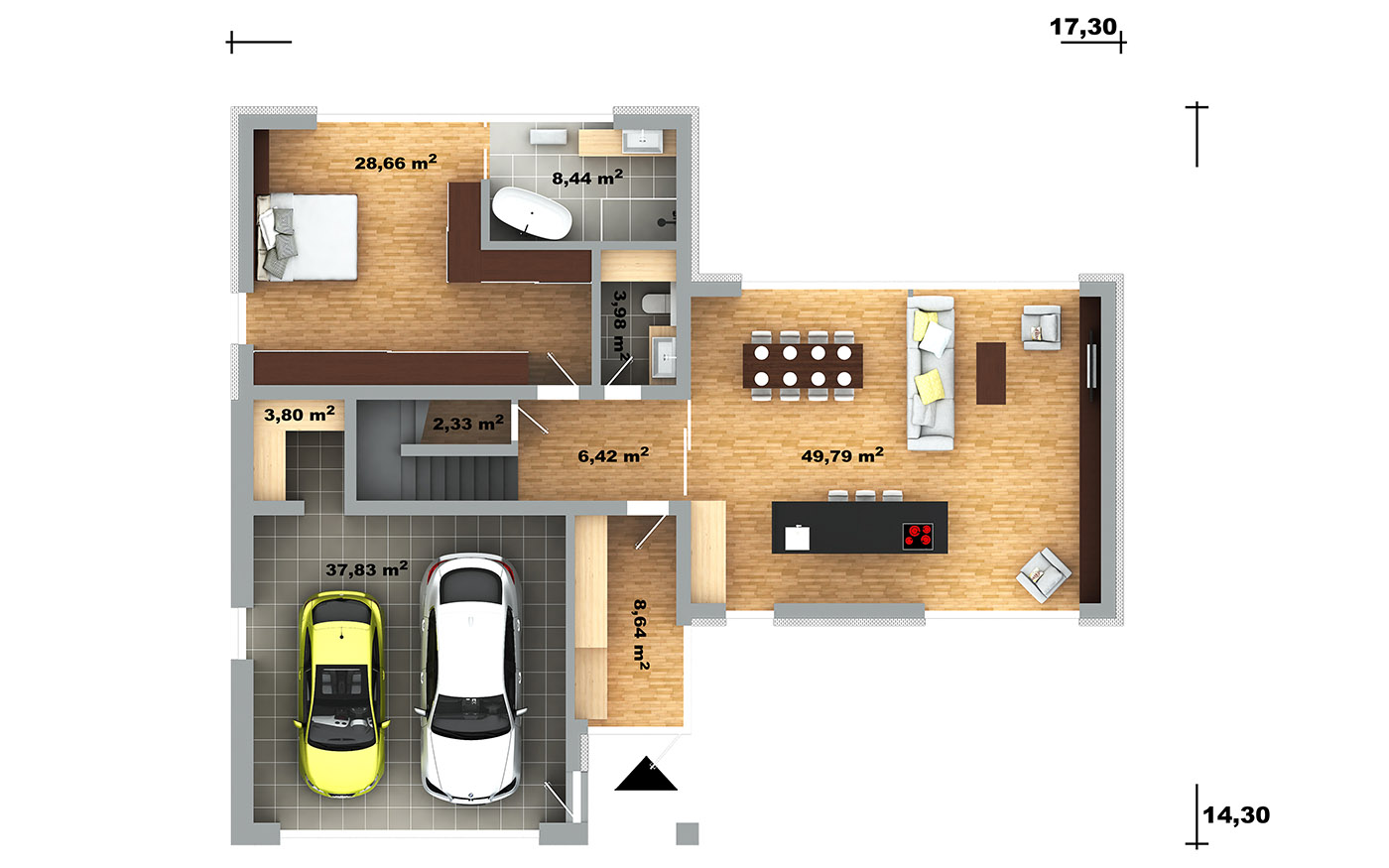 W drugiej części domu znajdują się wszystkie pozostałe pomieszczenia. Przy wejściu znajduje się przestronny dwustanowiskowy garaż z zapleczem technicznym, w korytarzu znajduje się duża garderoba, oddzielne WC oraz główna część prywatna dla rodziców.