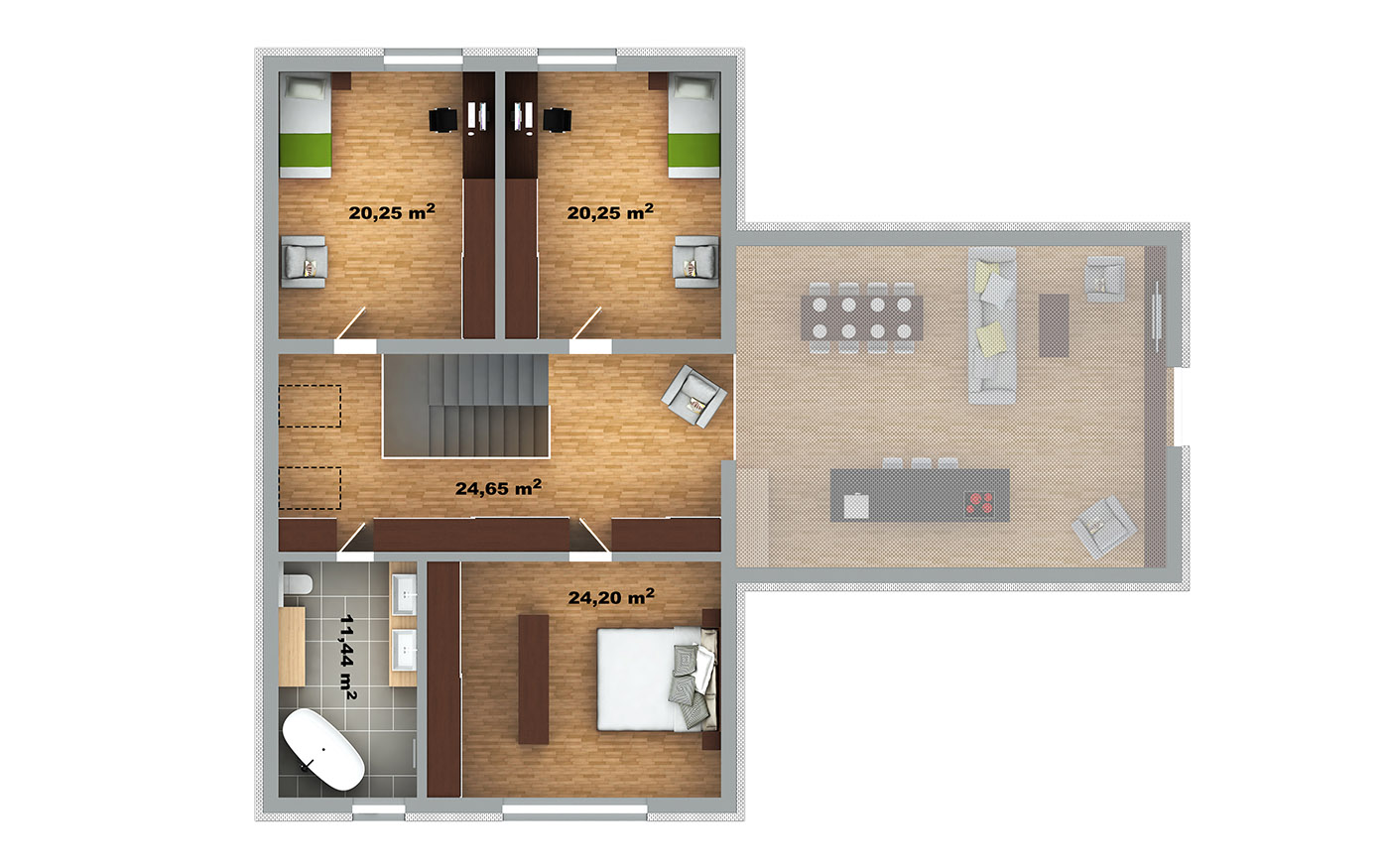 Po przejściu schodów na drugie piętro przestronny układ przechodzi w przyjemną galerię, za którą następują trzy bardzo przestronne pokoje i kolejna bardzo wygodna łazienka, w której znalazło się również miejsce na dużą narożną wannę.
