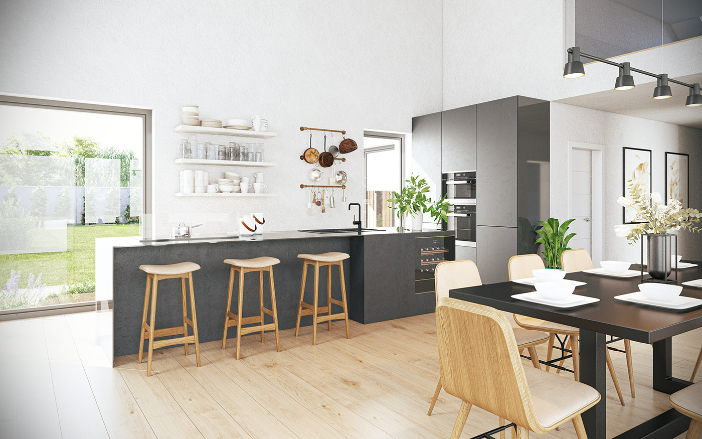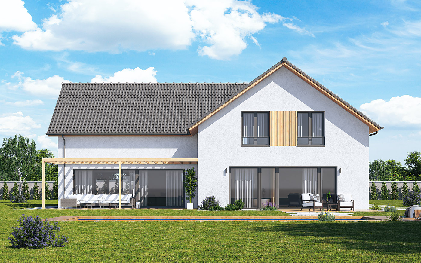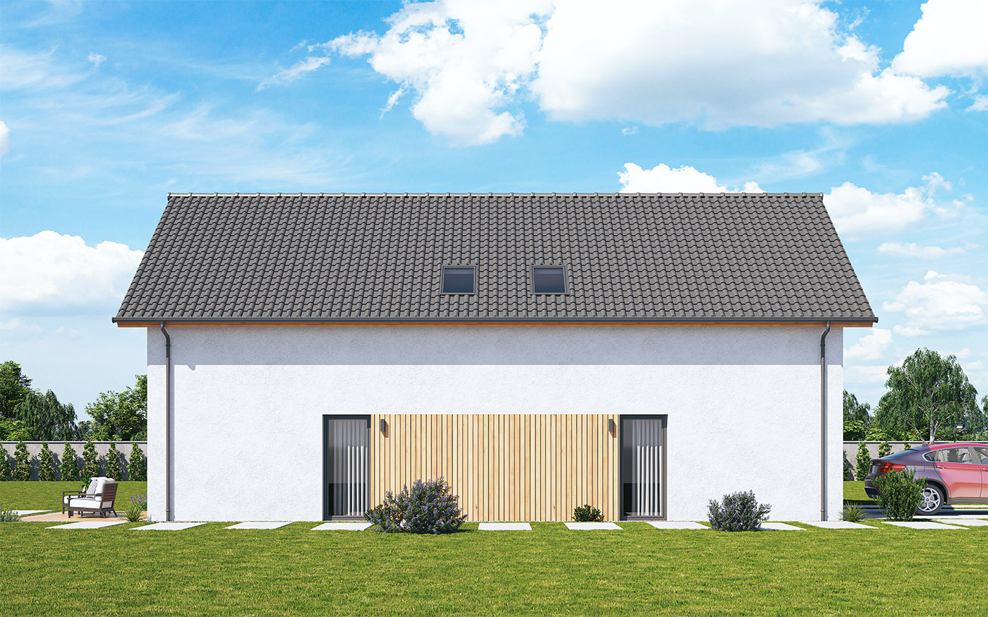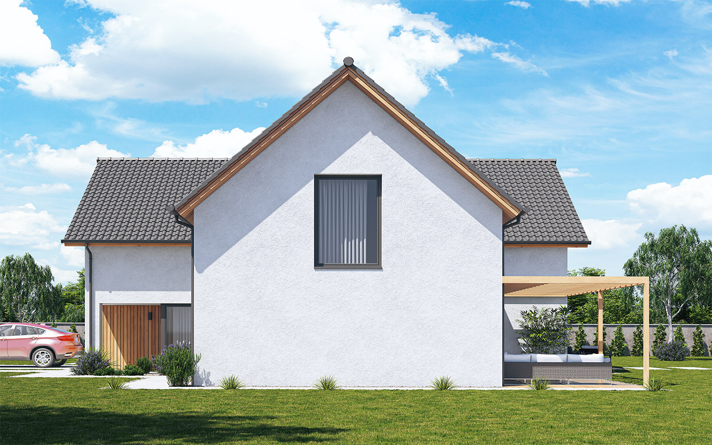 Rozległy dom z dwuspadowym dachem jest podzielony na dwie główne części. Boczna część bryły domu przeznaczona jest tylko i wyłącznie dla jednej funkcji i jest to główna przestrzeń domu – salon z jadalnią i kuchnią, które mają do dyspozycji 50 m2 powierzchni, otwartej na obie kondygnacje.