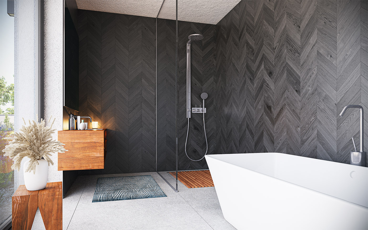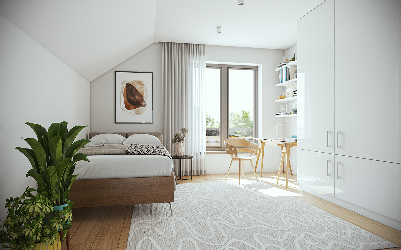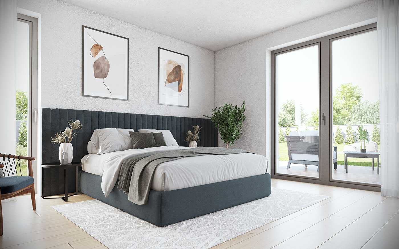 Zaprojektowano bardzo przestronnie, ze zintegrowaną garderobą oraz luksusową łazienką, która wraz z sypialnią posiada ogromne okno wychodzące na ogród.